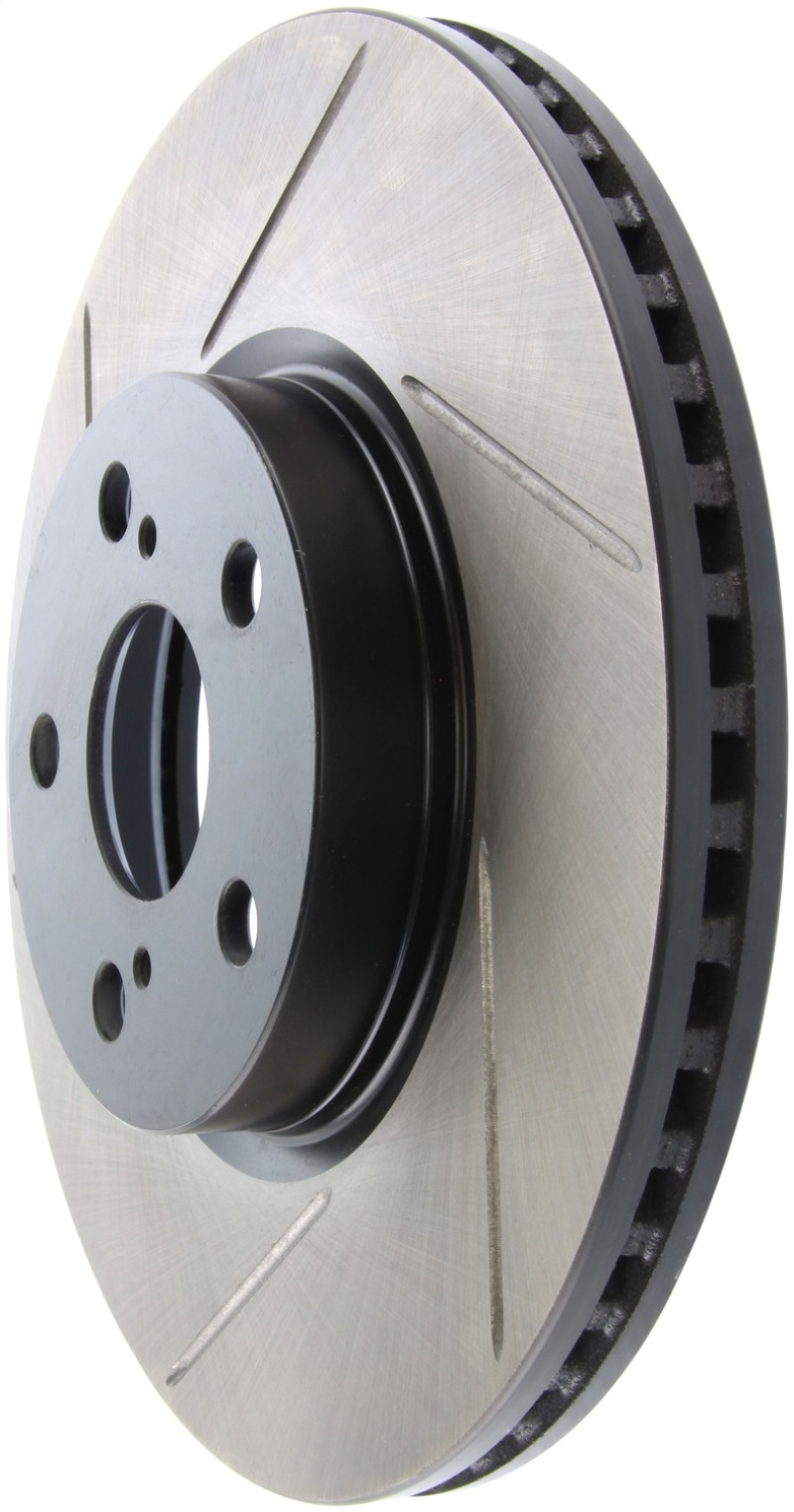StopTech Slotted Sport Rotors are 1-piece direct replacement brake discs for factory brake systems and stock calipers that look great behind your wheels * and offer significantly improved braking performance. The unique slotting aids with heat and brake dust dispersal; prevents glazing of the pads; adds bite and improves wet and dry braking performance. Built to last; the black e-coating provides protection from corrosion and the high carbon metallurgy (in most applications) offers quieter operation; better crack resistance and increased performance.