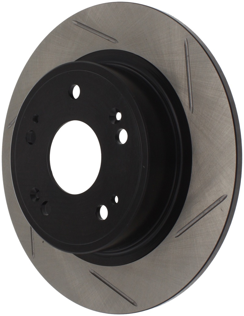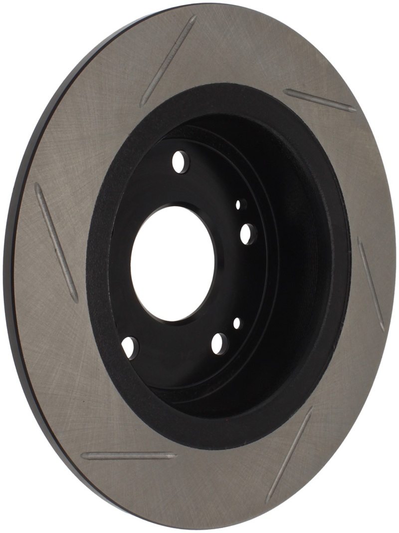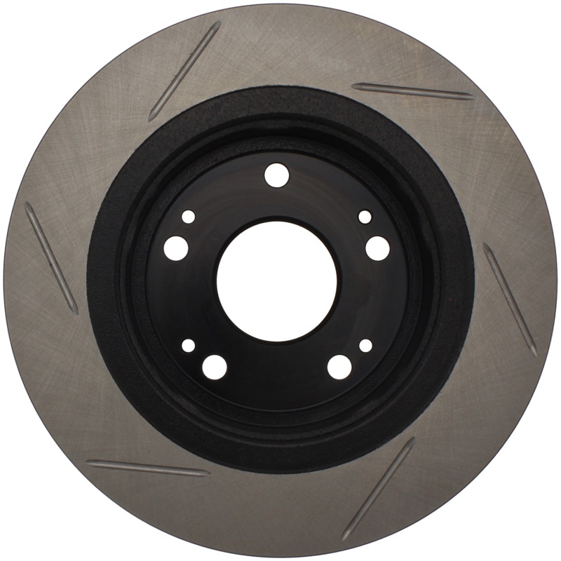 StopTech Slotted Sport Rotors are 1-piece direct replacement brake discs for factory brake systems and stock calipers that look great behind your wheels * and offer significantly improved braking performance. The unique slotting aids with heat and brake dust dispersal; prevents glazing of the pads; adds bite and improves wet and dry braking performance. Built to last; the black e-coating provides protection from corrosion and the high carbon metallurgy (in most applications) offers quieter operation; better crack resistance and increased performance.