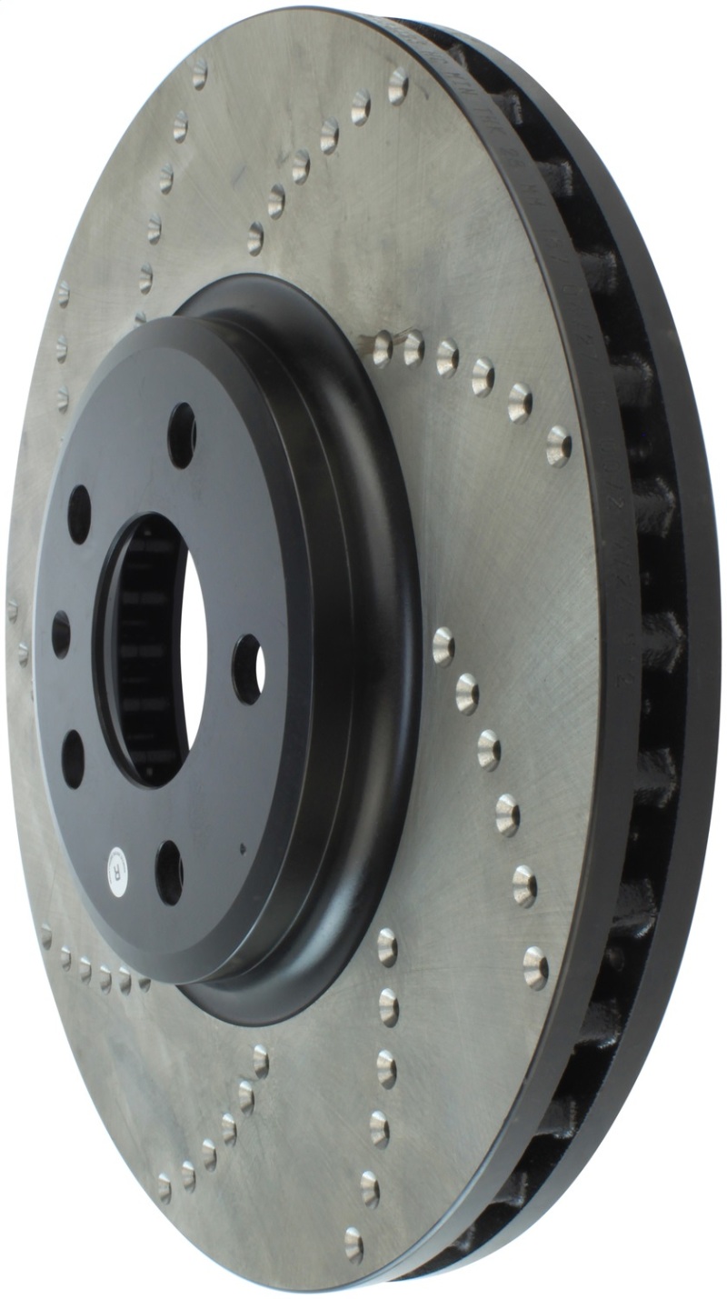 StopTech Drilled Sport Rotors are 1-piece direct replacement brake discs for factory brake systems and stock calipers that look great behind your wheels * and offer significantly improved braking performance. The unique cross-drilling aids with heat and brake dust dispersal; prevents glazing of the pads; adds bite and improves wet and dry braking performance. Built to last; the black e-coating provides protection from corrosion and the high carbon metallurgy (in most applications) offers quieter operation; better crack resistance and increased performance.