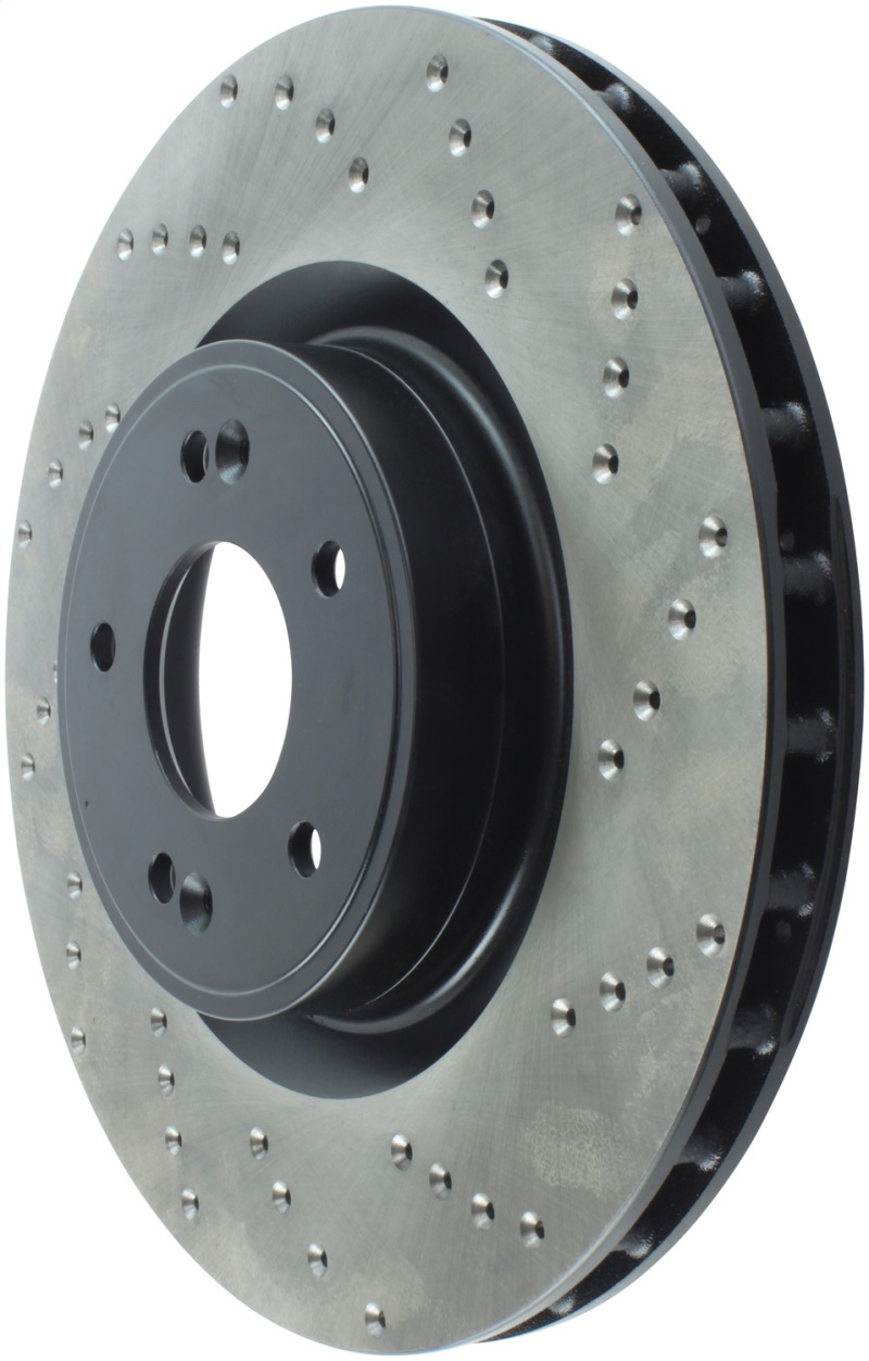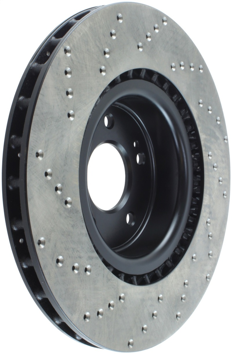 StopTech Drilled Sport Rotors are 1-piece direct replacement brake discs for factory brake systems and stock calipers that look great behind your wheels * and offer significantly improved braking performance. The unique cross-drilling aids with heat and brake dust dispersal; prevents glazing of the pads; adds bite and improves wet and dry braking performance. Built to last; the black e-coating provides protection from corrosion and the high carbon metallurgy (in most applications) offers quieter operation; better crack resistance and increased performance.