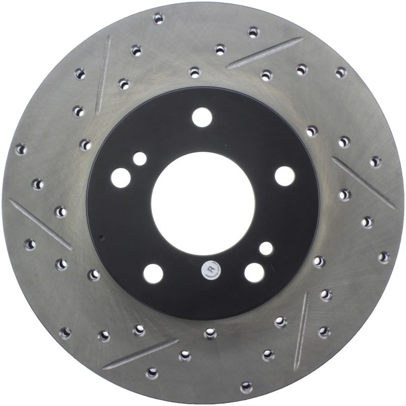StopTech Drilled and Slotted Sport Rotors are 1-piece direct replacement brake discs for factory brake systems and stock calipers that look great behind your wheels * and offer significantly improved braking performance. The unique cross-drilling and slotting aids with heat and brake dust dispersal; prevents glazing of the pads; adds bite and improves wet and dry braking performance. Built to last; the black e-coating provides protection from corrosion and the high carbon metallurgy (in most applications) offers quieter operation; better crack resistance and increased performance.
