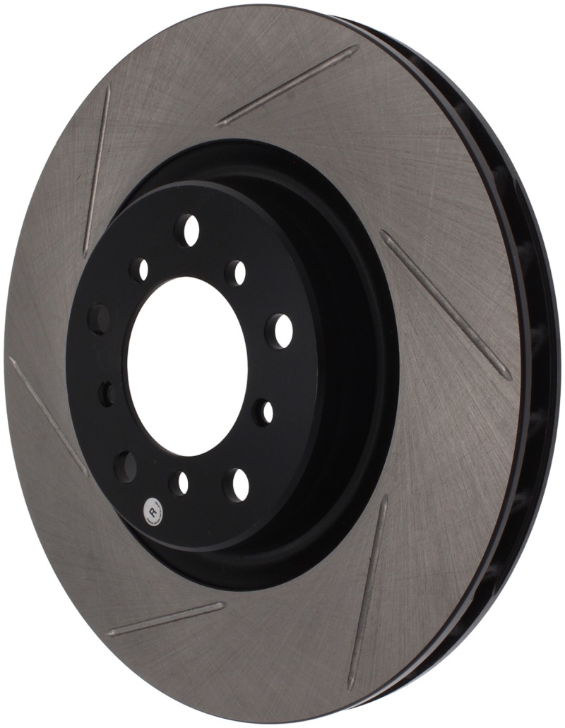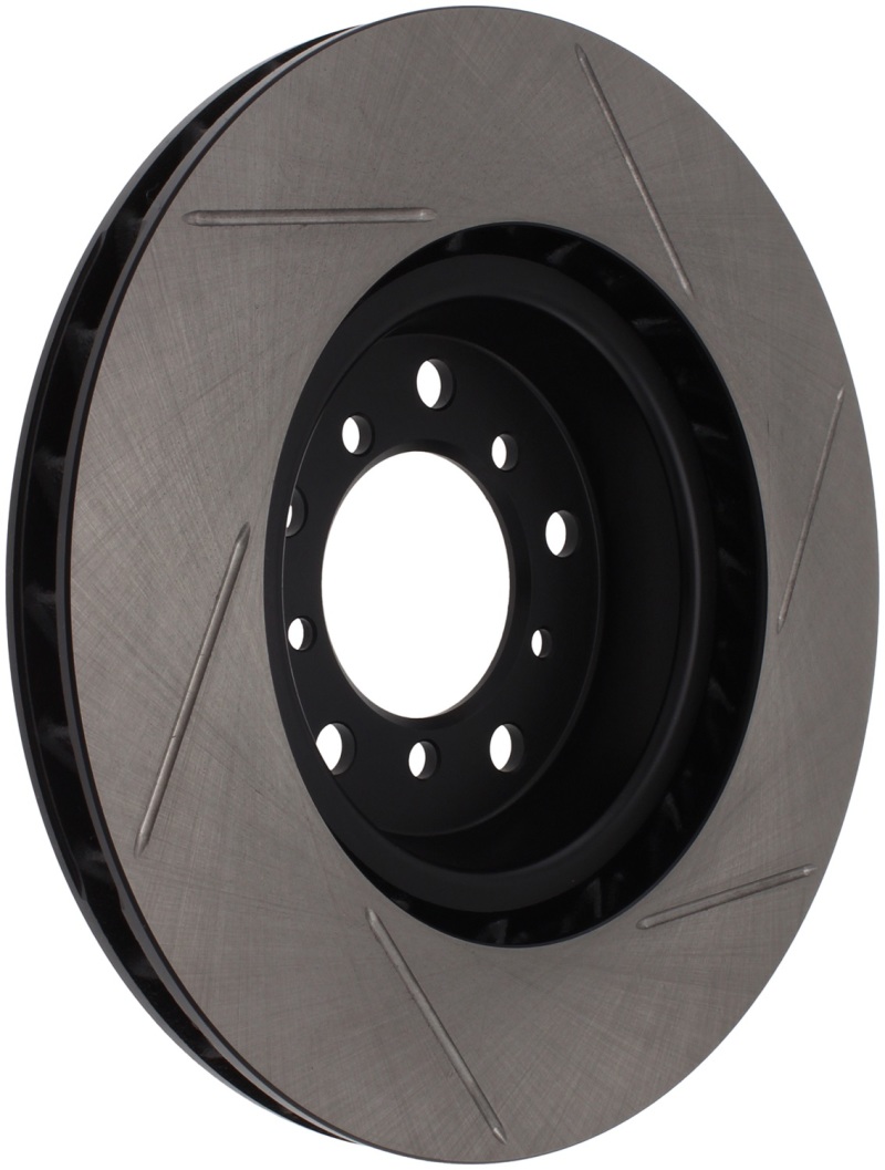 StopTech Slotted Sport Rotors are 1-piece direct replacement brake discs for factory brake systems and stock calipers that look great behind your wheels * and offer significantly improved braking performance. The unique slotting aids with heat and brake dust dispersal; prevents glazing of the pads; adds bite and improves wet and dry braking performance. Built to last; the black e-coating provides protection from corrosion and the high carbon metallurgy (in most applications) offers quieter operation; better crack resistance and increased performance.