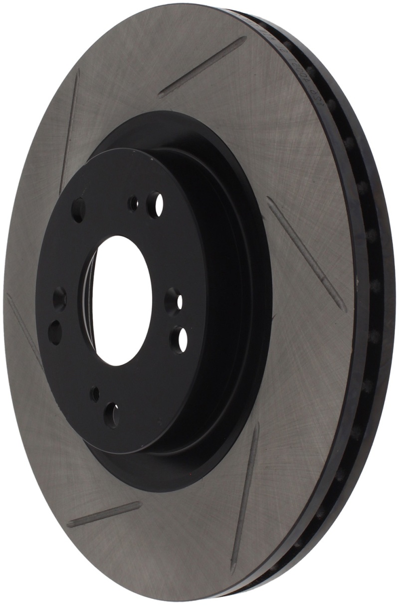 StopTech Slotted Sport Rotors are 1-piece direct replacement brake discs for factory brake systems and stock calipers that look great behind your wheels * and offer significantly improved braking performance. The unique slotting aids with heat and brake dust dispersal; prevents glazing of the pads; adds bite and improves wet and dry braking performance. Built to last; the black e-coating provides protection from corrosion and the high carbon metallurgy (in most applications) offers quieter operation; better crack resistance and increased performance.