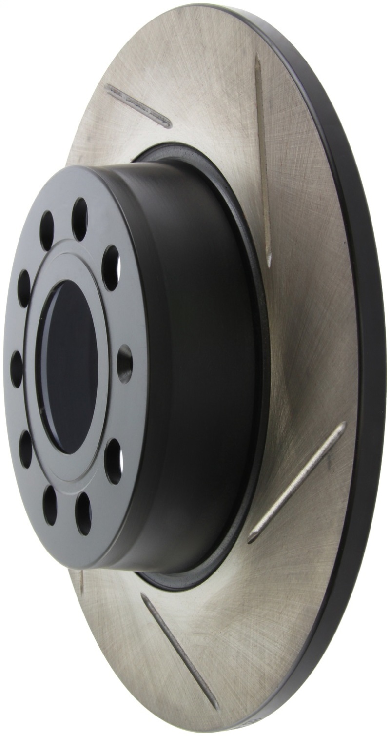 StopTech Slotted Sport Rotors are 1-piece direct replacement brake discs for factory brake systems and stock calipers that look great behind your wheels * and offer significantly improved braking performance. The unique slotting aids with heat and brake dust dispersal; prevents glazing of the pads; adds bite and improves wet and dry braking performance. Built to last; the black e-coating provides protection from corrosion and the high carbon metallurgy (in most applications) offers quieter operation; better crack resistance and increased performance.
