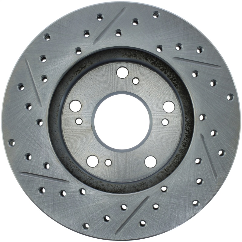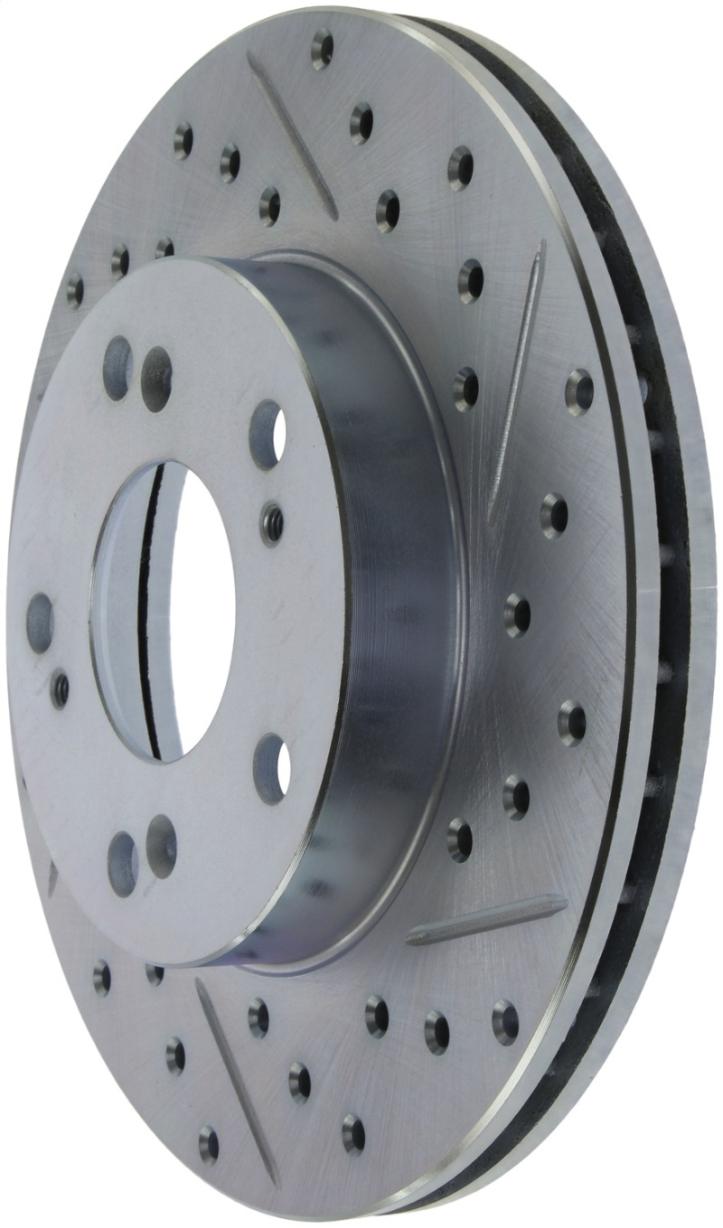 StopTech Drilled and Slotted Sport Rotors are 1-piece direct replacement brake discs for factory brake systems and stock calipers that look great behind your wheels * and offer significantly improved braking performance. The unique cross-drilling and slotting aids with heat and brake dust dispersal; prevents glazing of the pads; adds bite and improves wet and dry braking performance. Built to last; the black e-coating provides protection from corrosion and the high carbon metallurgy (in most applications) offers quieter operation; better crack resistance and increased performance.