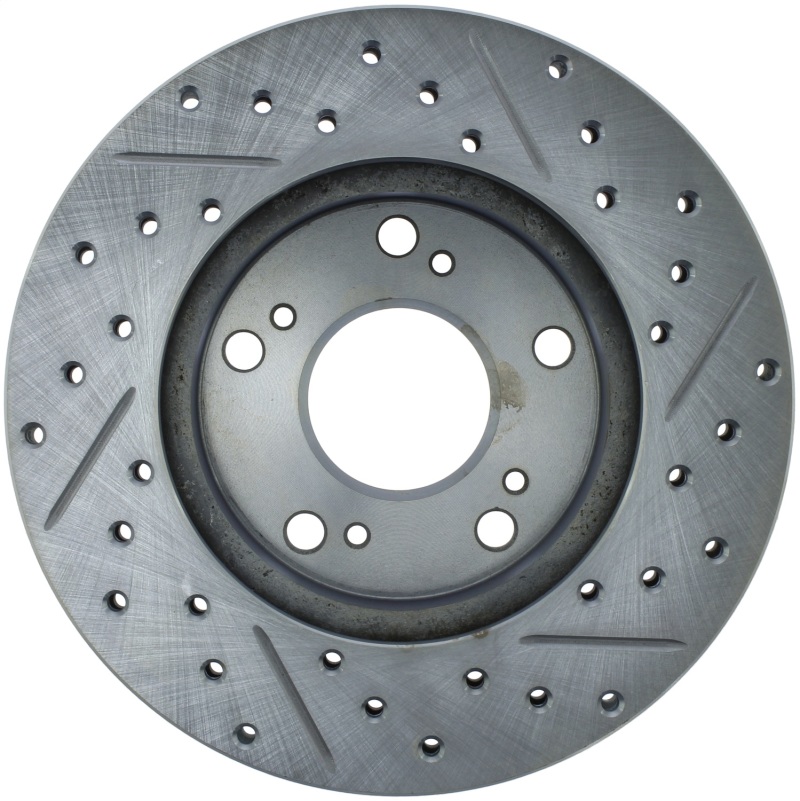 StopTech Drilled and Slotted Sport Rotors are 1-piece direct replacement brake discs for factory brake systems and stock calipers that look great behind your wheels * and offer significantly improved braking performance. The unique cross-drilling and slotting aids with heat and brake dust dispersal; prevents glazing of the pads; adds bite and improves wet and dry braking performance. Built to last; the black e-coating provides protection from corrosion and the high carbon metallurgy (in most applications) offers quieter operation; better crack resistance and increased performance.