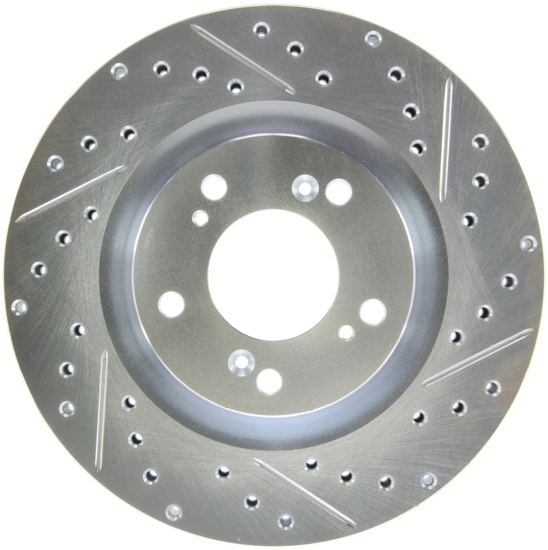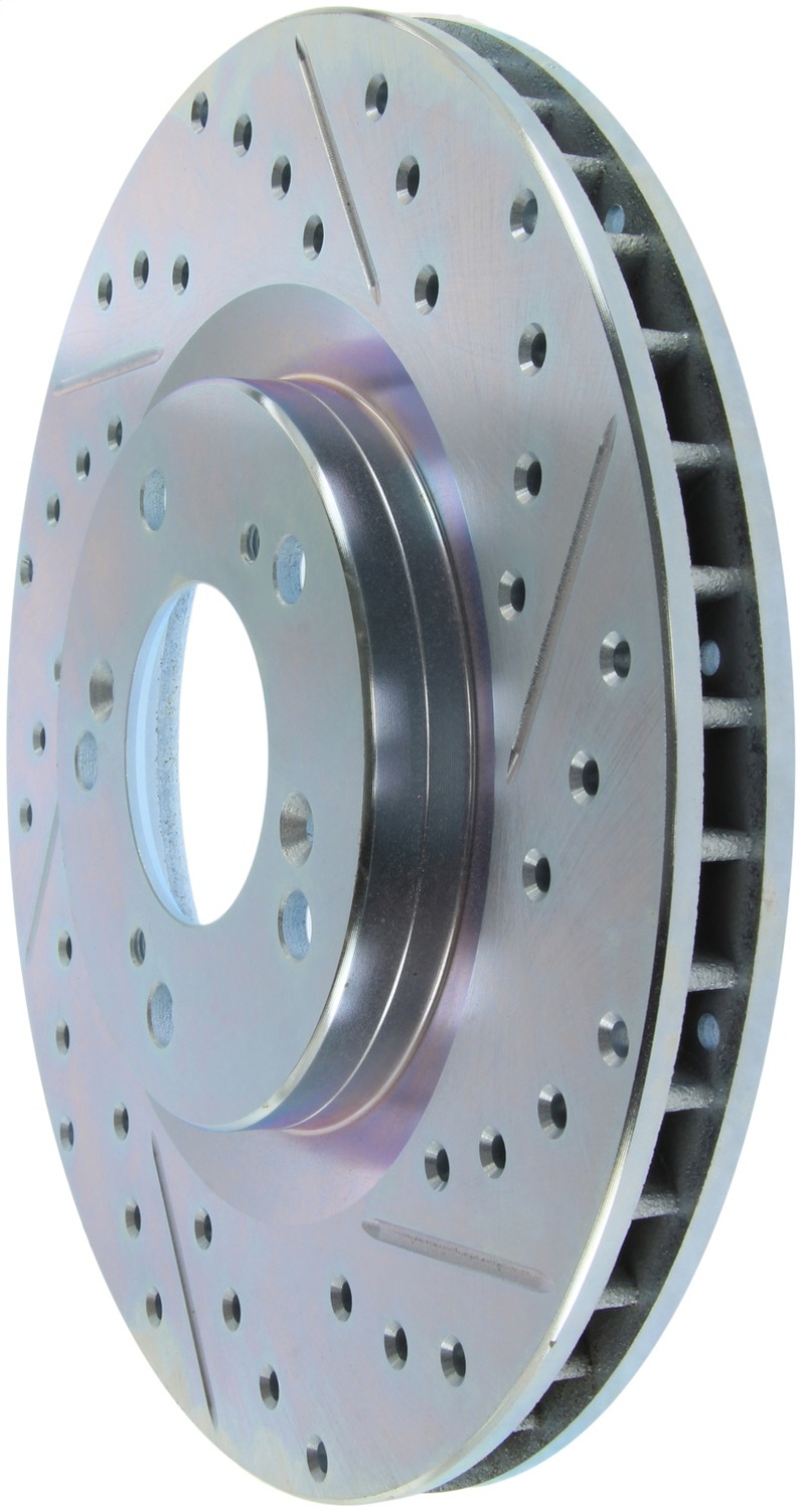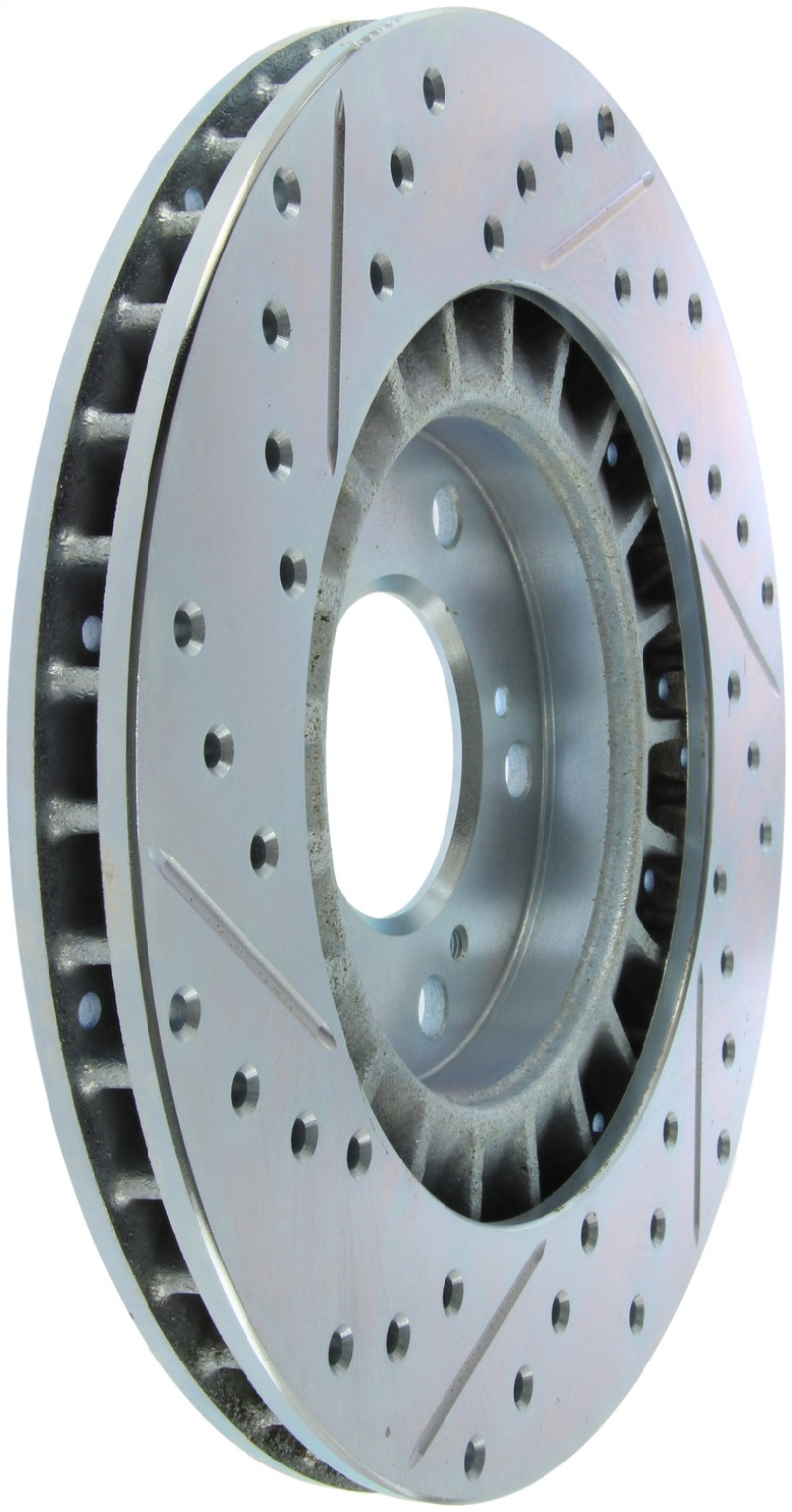 StopTech Drilled and Slotted Sport Rotors are 1-piece direct replacement brake discs for factory brake systems and stock calipers that look great behind your wheels * and offer significantly improved braking performance. The unique cross-drilling and slotting aids with heat and brake dust dispersal; prevents glazing of the pads; adds bite and improves wet and dry braking performance. Built to last; the black e-coating provides protection from corrosion and the high carbon metallurgy (in most applications) offers quieter operation; better crack resistance and increased performance.