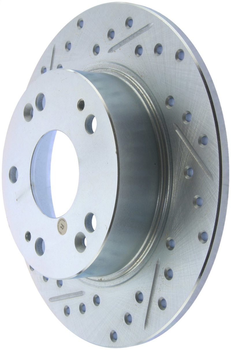 StopTech Drilled and Slotted Sport Rotors are 1-piece direct replacement brake discs for factory brake systems and stock calipers that look great behind your wheels * and offer significantly improved braking performance. The unique cross-drilling and slotting aids with heat and brake dust dispersal; prevents glazing of the pads; adds bite and improves wet and dry braking performance. Built to last; the black e-coating provides protection from corrosion and the high carbon metallurgy (in most applications) offers quieter operation; better crack resistance and increased performance.