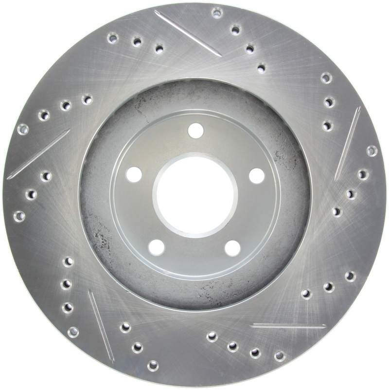 StopTech Drilled and Slotted Sport Rotors are 1-piece direct replacement brake discs for factory brake systems and stock calipers that look great behind your wheels * and offer significantly improved braking performance. The unique cross-drilling and slotting aids with heat and brake dust dispersal; prevents glazing of the pads; adds bite and improves wet and dry braking performance. Built to last; the black e-coating provides protection from corrosion and the high carbon metallurgy (in most applications) offers quieter operation; better crack resistance and increased performance.
