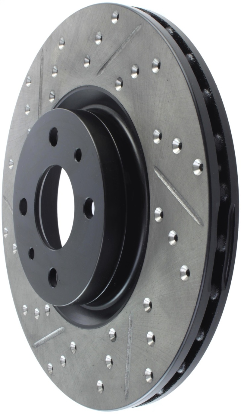 StopTech Drilled and Slotted Sport Rotors are 1-piece direct replacement brake discs for factory brake systems and stock calipers that look great behind your wheels * and offer significantly improved braking performance. The unique cross-drilling and slotting aids with heat and brake dust dispersal; prevents glazing of the pads; adds bite and improves wet and dry braking performance. Built to last; the black e-coating provides protection from corrosion and the high carbon metallurgy (in most applications) offers quieter operation; better crack resistance and increased performance.