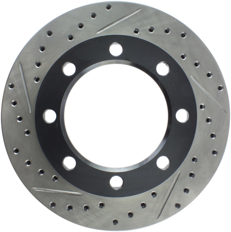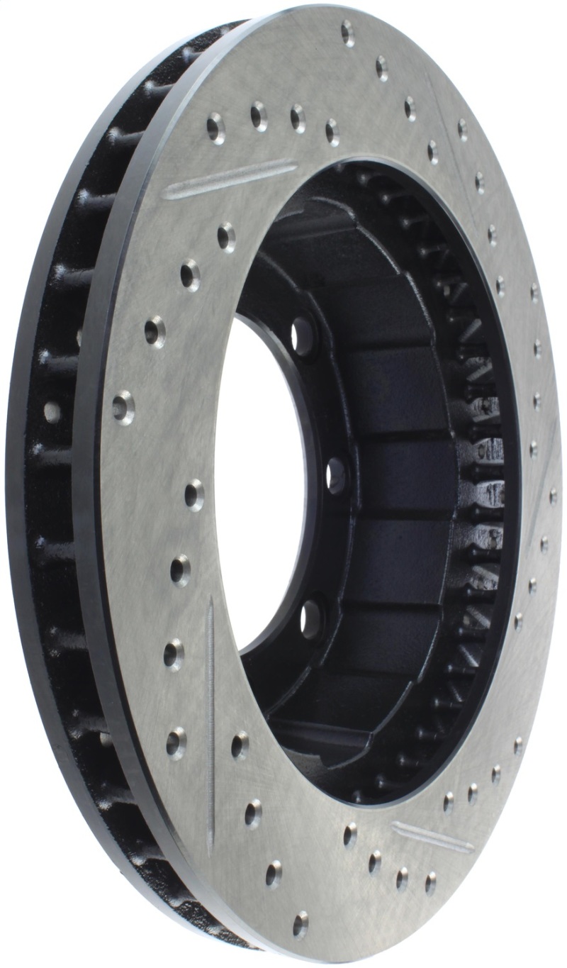 StopTech Drilled and Slotted Sport Rotors are 1-piece direct replacement brake discs for factory brake systems and stock calipers that look great behind your wheels * and offer significantly improved braking performance. The unique cross-drilling and slotting aids with heat and brake dust dispersal; prevents glazing of the pads; adds bite and improves wet and dry braking performance. Built to last; the black e-coating provides protection from corrosion and the high carbon metallurgy (in most applications) offers quieter operation; better crack resistance and increased performance.