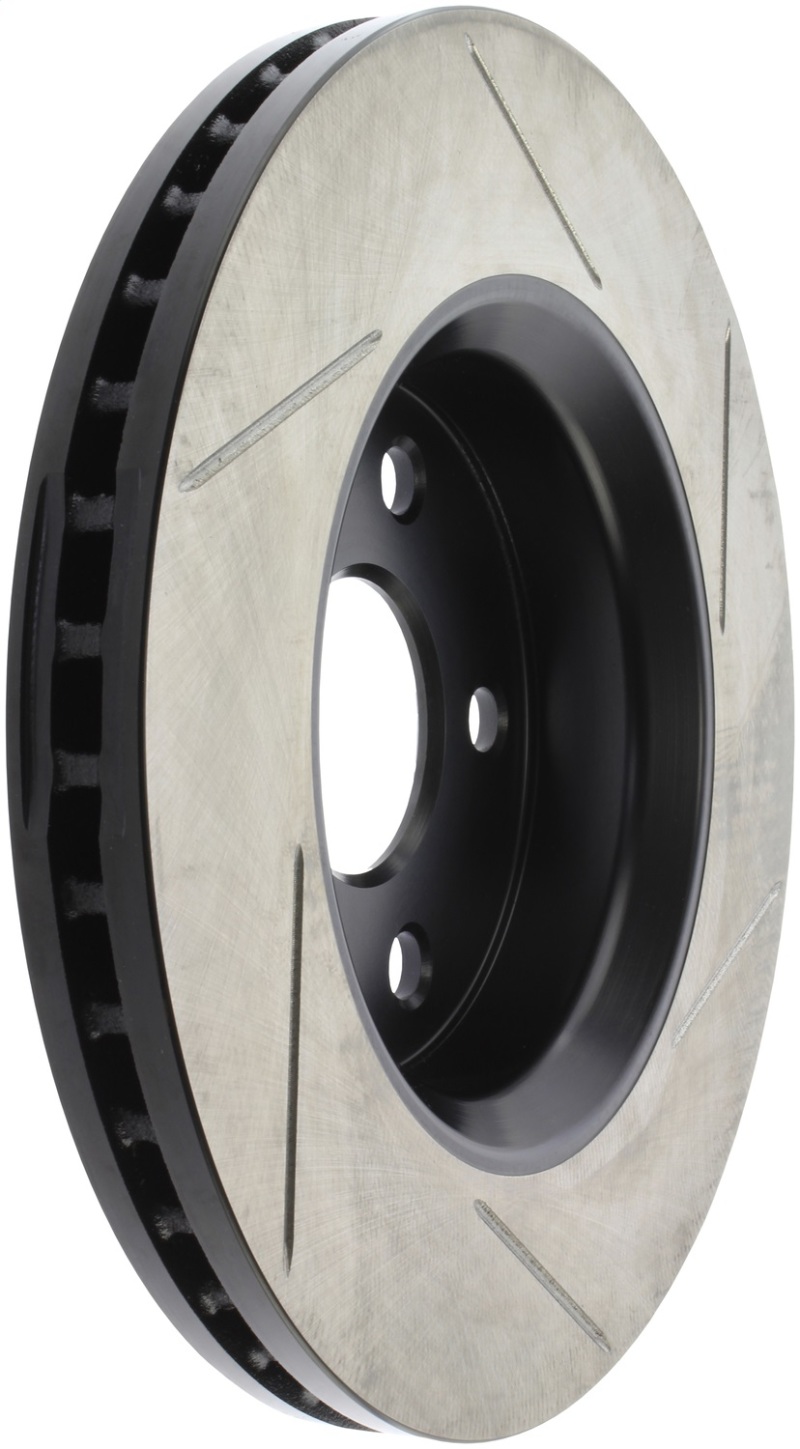 StopTech Slotted Sport Rotors are 1-piece direct replacement brake discs for factory brake systems and stock calipers that look great behind your wheels * and offer significantly improved braking performance. The unique slotting aids with heat and brake dust dispersal; prevents glazing of the pads; adds bite and improves wet and dry braking performance. Built to last; the black e-coating provides protection from corrosion and the high carbon metallurgy (in most applications) offers quieter operation; better crack resistance and increased performance.