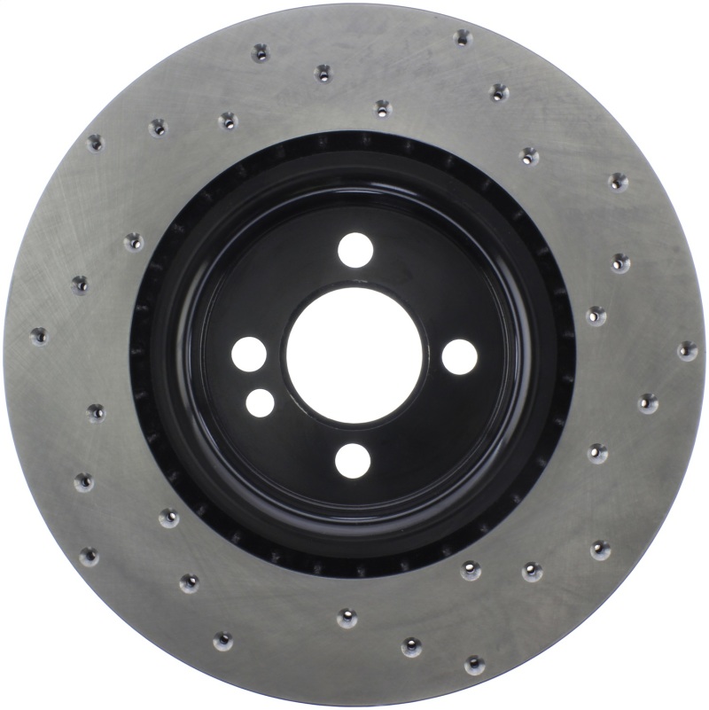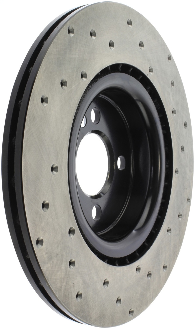StopTech Drilled Sport Rotors are 1-piece direct replacement brake discs for factory brake systems and stock calipers that look great behind your wheels * and offer significantly improved braking performance. The unique cross-drilling aids with heat and brake dust dispersal; prevents glazing of the pads; adds bite and improves wet and dry braking performance. Built to last; the black e-coating provides protection from corrosion and the high carbon metallurgy (in most applications) offers quieter operation; better crack resistance and increased performance.