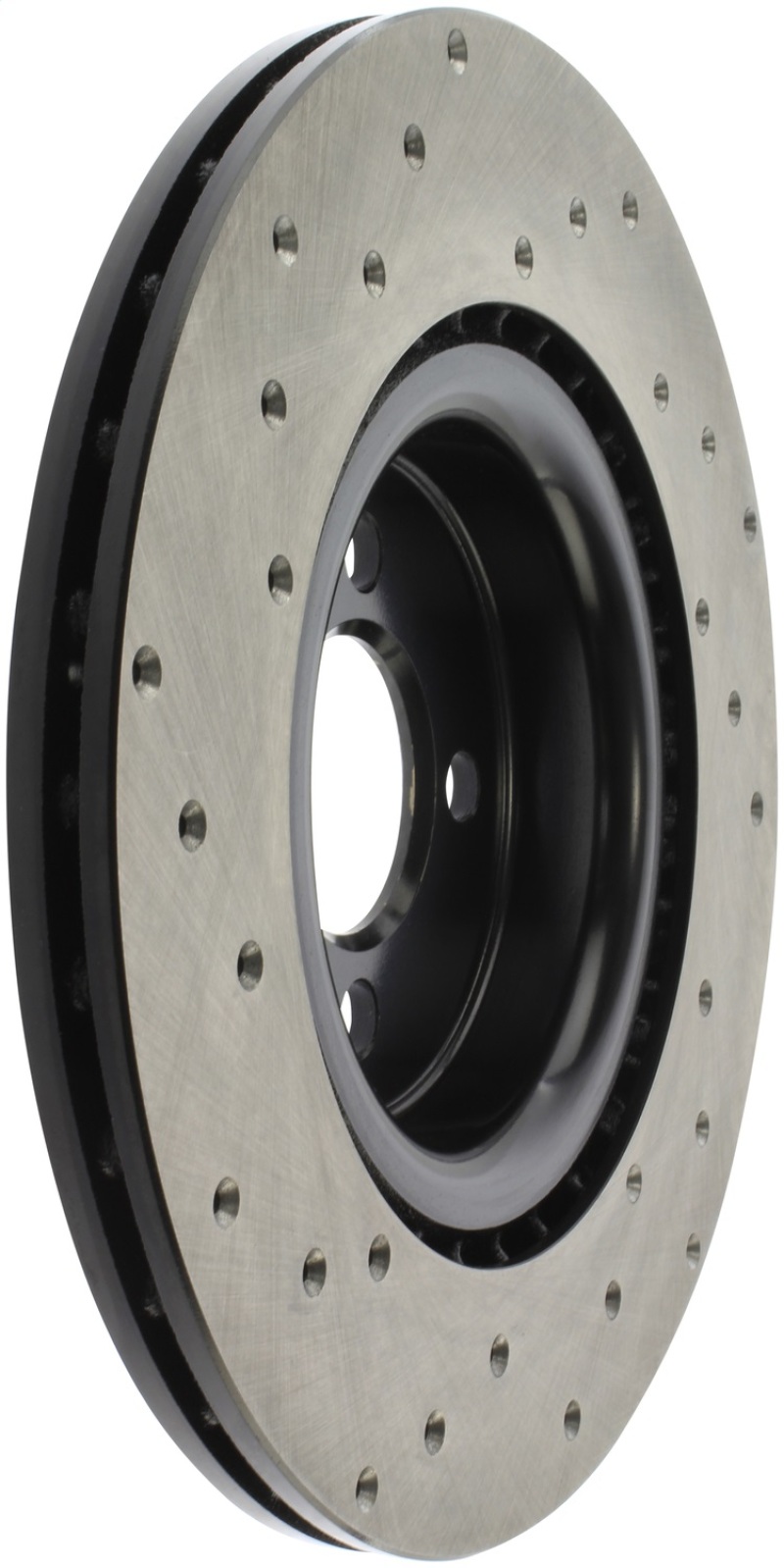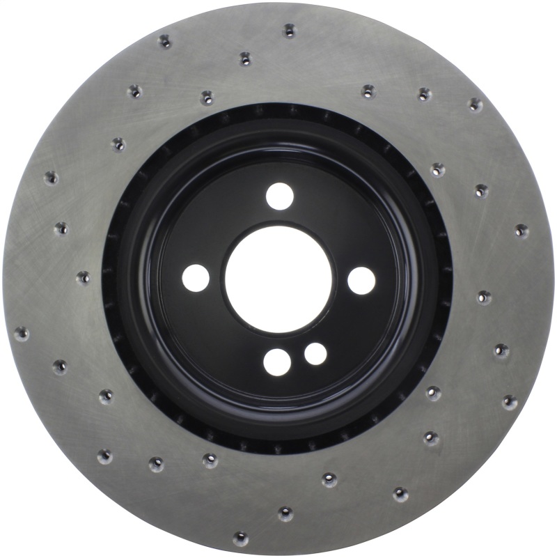 StopTech Drilled Sport Rotors are 1-piece direct replacement brake discs for factory brake systems and stock calipers that look great behind your wheels * and offer significantly improved braking performance. The unique cross-drilling aids with heat and brake dust dispersal; prevents glazing of the pads; adds bite and improves wet and dry braking performance. Built to last; the black e-coating provides protection from corrosion and the high carbon metallurgy (in most applications) offers quieter operation; better crack resistance and increased performance.