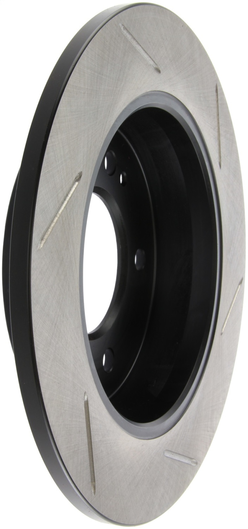 StopTech Slotted Sport Rotors are 1-piece direct replacement brake discs for factory brake systems and stock calipers that look great behind your wheels * and offer significantly improved braking performance. The unique slotting aids with heat and brake dust dispersal; prevents glazing of the pads; adds bite and improves wet and dry braking performance. Built to last; the black e-coating provides protection from corrosion and the high carbon metallurgy (in most applications) offers quieter operation; better crack resistance and increased performance.