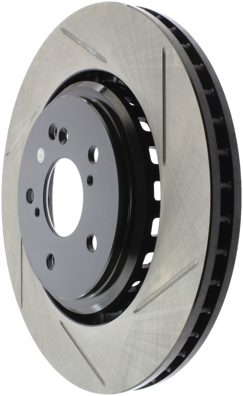StopTech Slotted Sport Rotors are 1-piece direct replacement brake discs for factory brake systems and stock calipers that look great behind your wheels * and offer significantly improved braking performance. The unique slotting aids with heat and brake dust dispersal; prevents glazing of the pads; adds bite and improves wet and dry braking performance. Built to last; the black e-coating provides protection from corrosion and the high carbon metallurgy (in most applications) offers quieter operation; better crack resistance and increased performance.