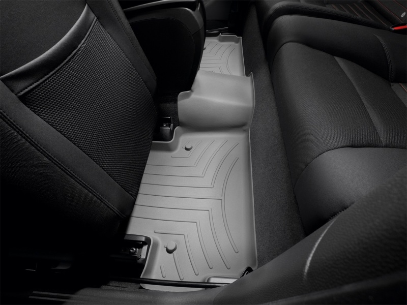 The WeatherTech FloorLiner DigitalFit accurately and completely lines the interior carpet giving "absolute interior protection". Digital laser measurements of interior surfaces offer a consistently perfect fit. A patent pending HighDensity TriExtruded (HDTE) material allows for a rigid core for strength while offering surface friction to the carpet, as well as tactile feel to the surface. Advanced surfacing creates channels that carry fluids and debris to a lower reservoir with further channeling to help minimize fluid movement while driving. Once fluids become trapped in the reservoir, away from shoes and clothing, they are easily removed from the WeatherTech FloorLiner DigitalFit over the door sill. No muss-no fuss. 3 year warranty. FloorLiner™ DigitalFit®; Gray; Rear;