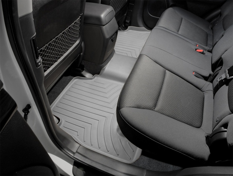 The WeatherTech FloorLiner DigitalFit accurately and completely lines the interior carpet giving "absolute interior protection". Digital laser measurements of interior surfaces offer a consistently perfect fit. A patent pending HighDensity TriExtruded (HDTE) material allows for a rigid core for strength while offering surface friction to the carpet, as well as tactile feel to the surface. Advanced surfacing creates channels that carry fluids and debris to a lower reservoir with further channeling to help minimize fluid movement while driving. Once fluids become trapped in the reservoir, away from shoes and clothing, they are easily removed from the WeatherTech FloorLiner DigitalFit over the door sill. No muss-no fuss. 3 year warranty. FloorLiner™ DigitalFit®; Gray; Rear;
