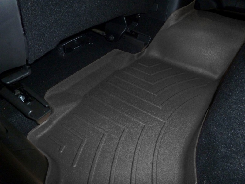 The WeatherTech FloorLiner DigitalFit accurately and completely lines the interior carpet giving "absolute interior protection". Digital laser measurements of interior surfaces offer a consistently perfect fit. A patent pending HighDensity TriExtruded (HDTE) material allows for a rigid core for strength while offering surface friction to the carpet, as well as tactile feel to the surface. Advanced surfacing creates channels that carry fluids and debris to a lower reservoir with further channeling to help minimize fluid movement while driving. Once fluids become trapped in the reservoir, away from shoes and clothing, they are easily removed from the WeatherTech FloorLiner DigitalFit over the door sill. No muss-no fuss. 3 year warranty. FloorLiner™ DigitalFit®; Black; Rear;