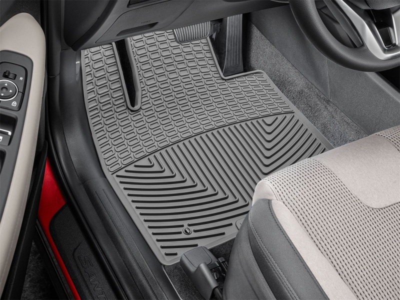 The WeatherTech All-Weather Floor Mats have deeply sculpted channels designed to trap water, road salt, mud and sand. They won't curl, crack or harden in sub-zero weather. Our All-Weather Floor Mats also have anti-skid ridges to prevent shifting in your vehicle and come with a protective, non-stick finish to make cleanup quick and easy. The All-Weather Floor Mats are made using advanced rubber-like, Thermoplastic Elastomer (TPE) compound making it both soft and durable. All Weather Floor Mats; Gray; Front;